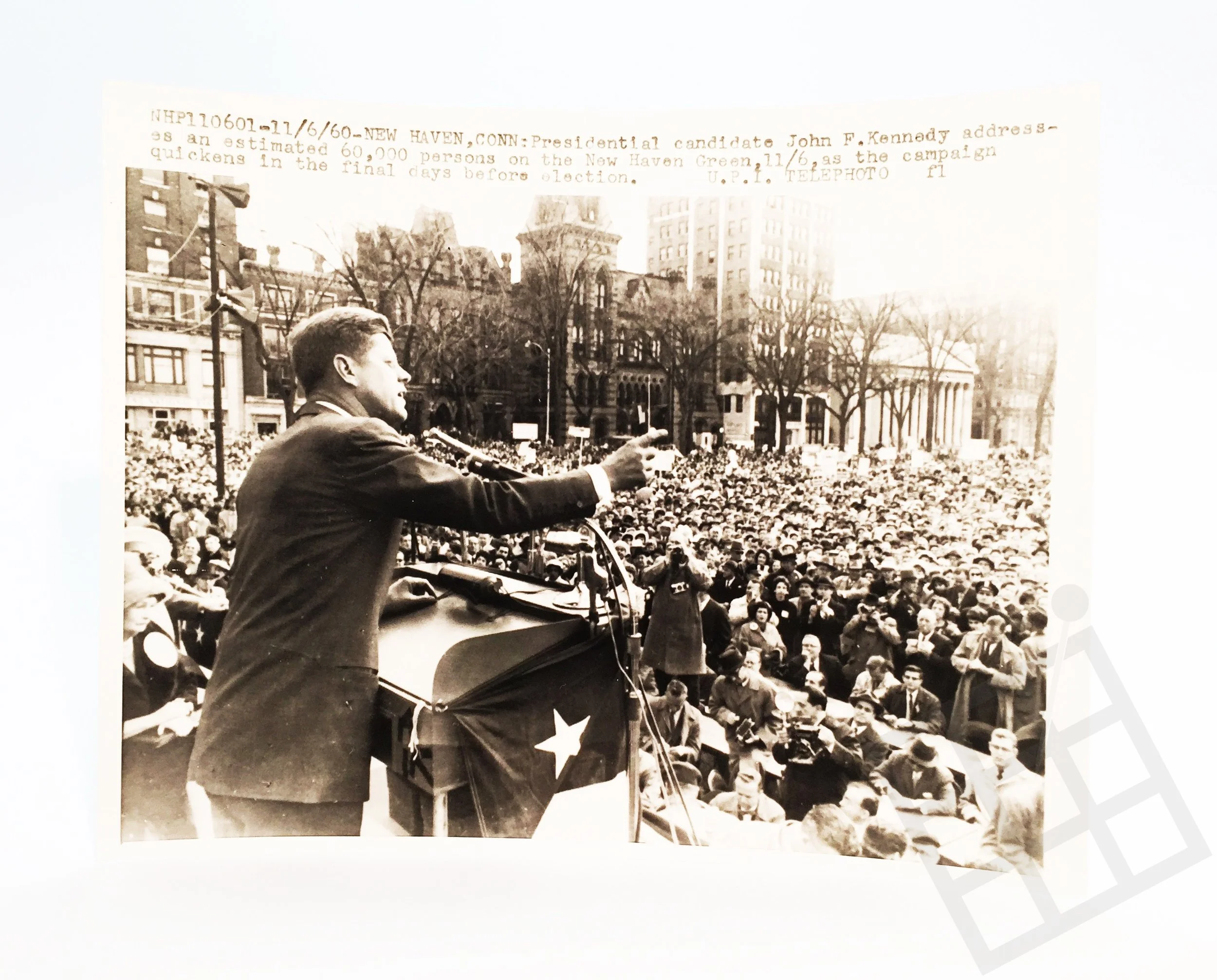 1960 photograph of then-Senator John F. Kennedy addressing the New Haven Green.