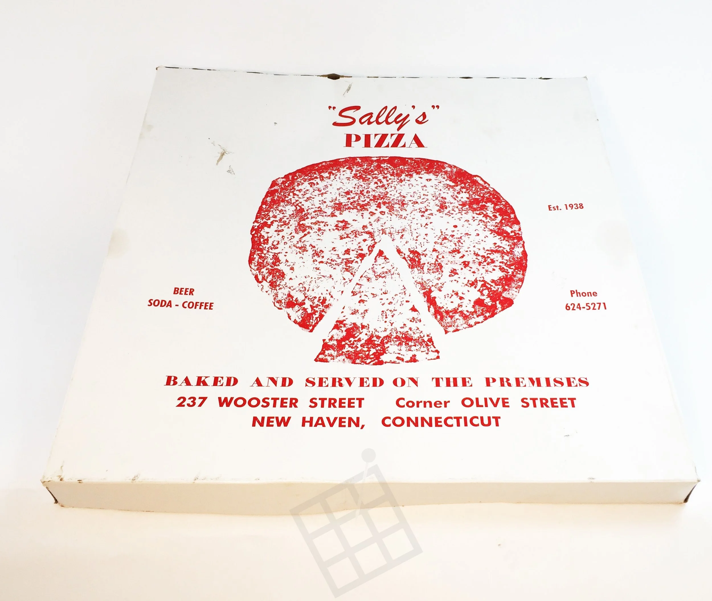Sally's (est. 1934) pizza box, c. modern day.