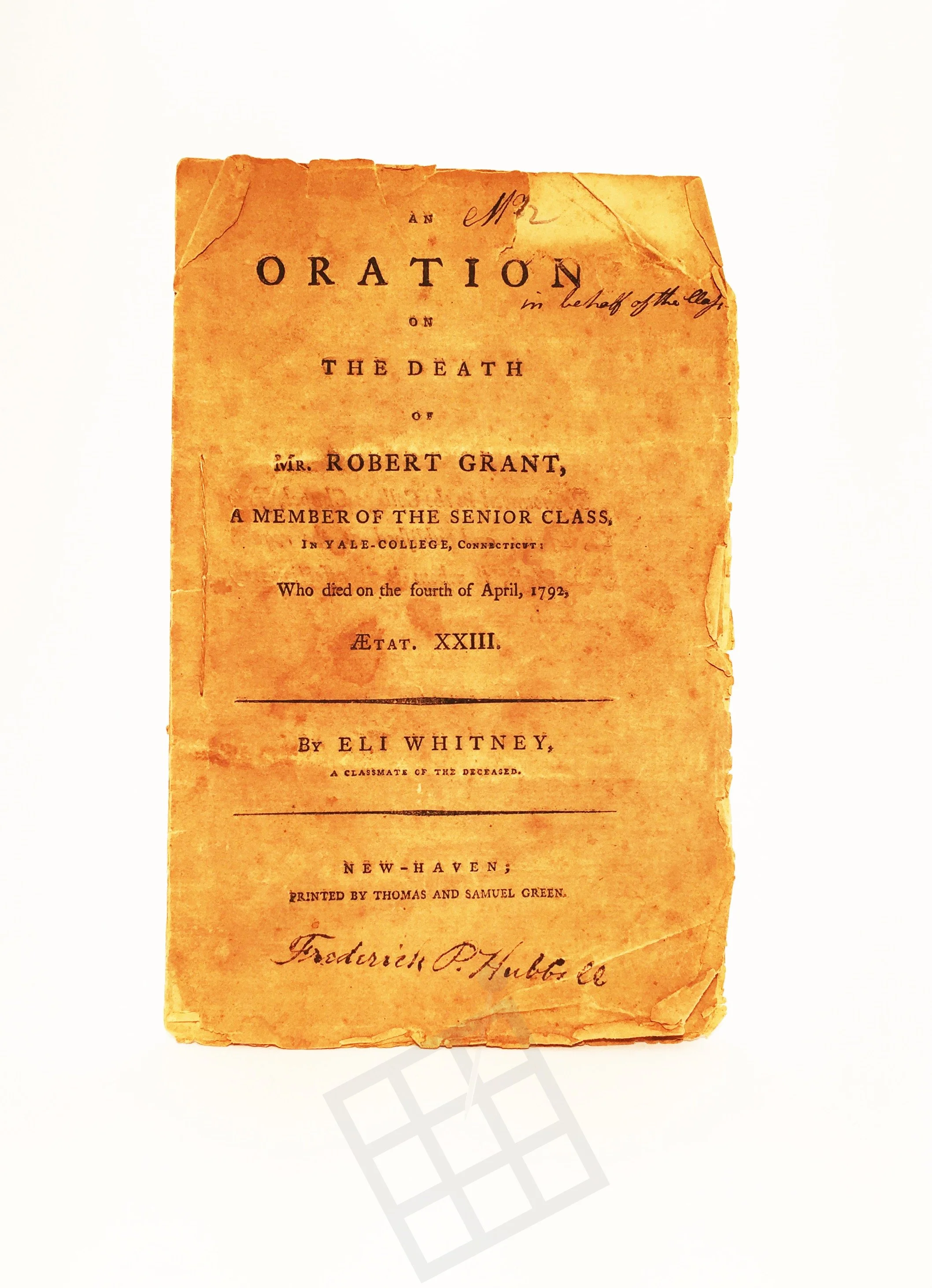 "Oration on the Death of Robert Grant," by Eli Whitney, 1792.