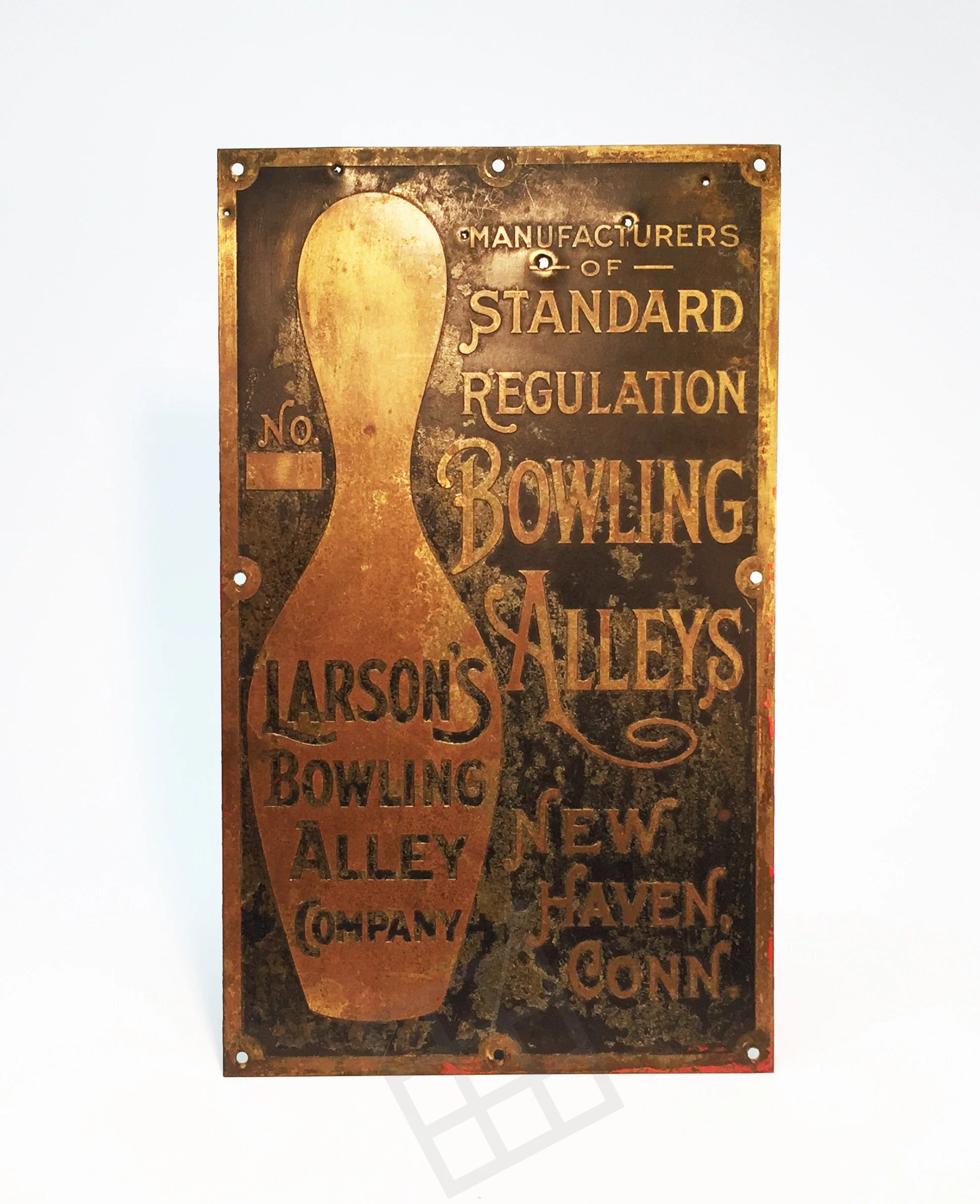 Metal placard for Larson's Bowling Alley Co., manufacturers of standard regulation bowling alleys, early 20th century.