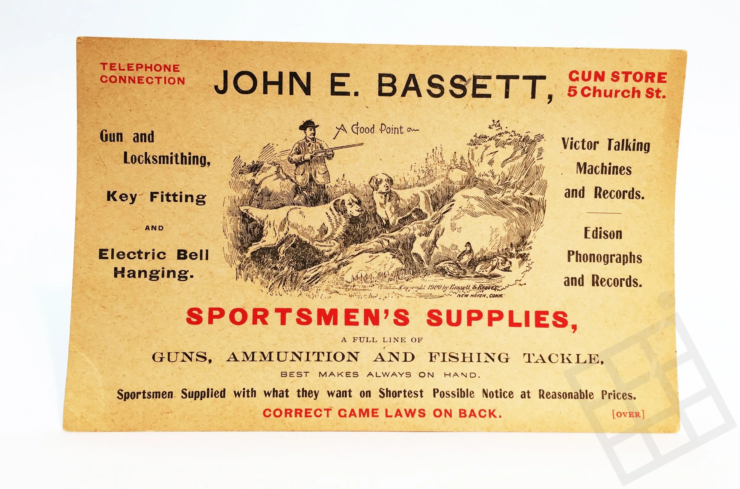 Advertisement card for John E. Bassett hardware and sportsmen supplies, the nation's longest-ran hardware firm (1784-1968).