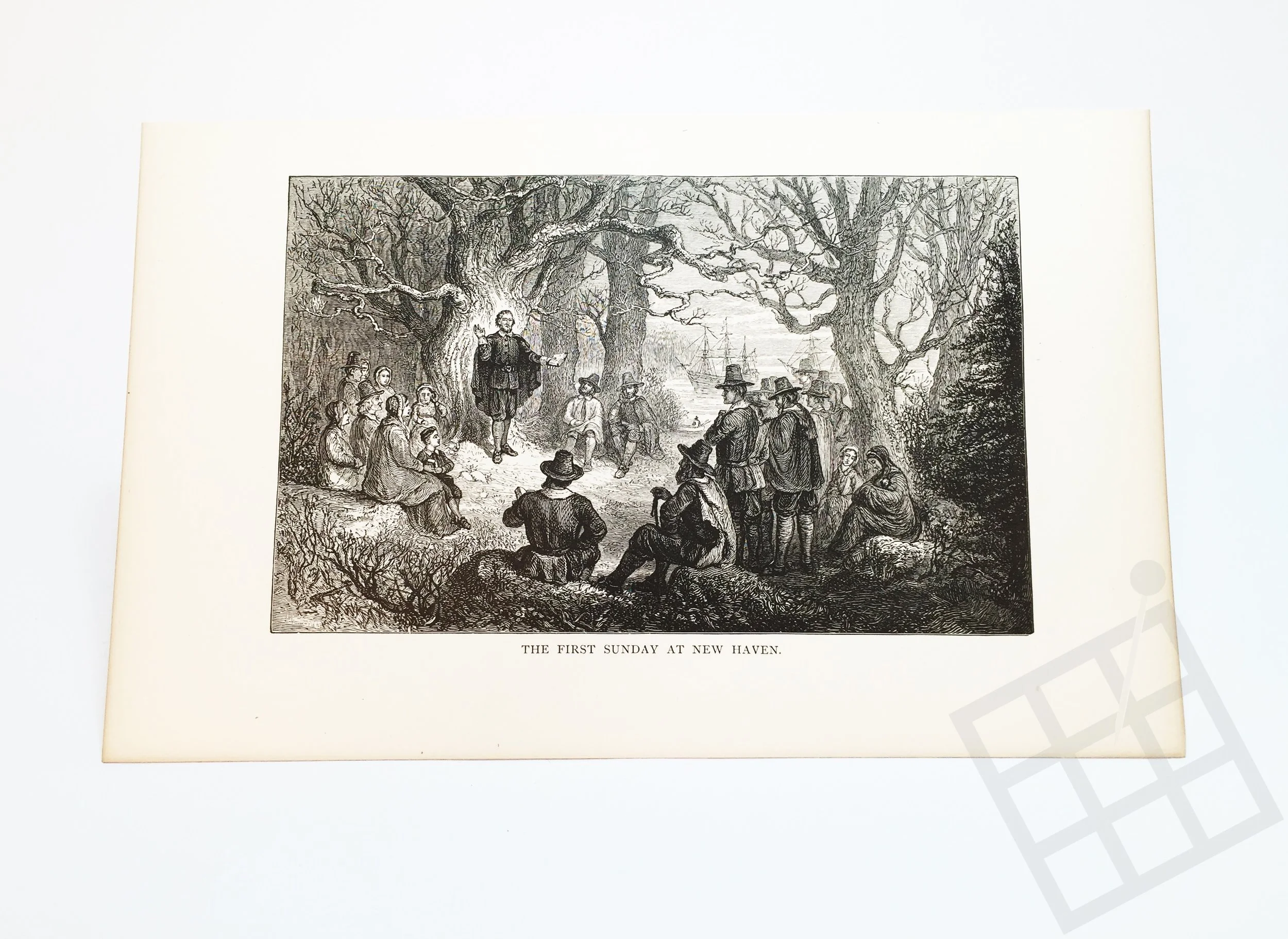 Print of 1881 "The First Sunday at New Haven" (unknown artist), depicting Davenport's first sermon with Puritan settlers at what is now the intersection of George and College Street on April 25, 1638.